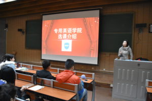 在滚动播放了专用英语学院英文简介视频后,廖鸿婧首先代表蔡鸿常务副院长向同学们的到来表示热烈欢迎和衷心感谢,介绍了目前国家、学校以及学院对同学们学好大学英语的重视。在详细介绍了我院现有的师资规模和教学特点之后,廖鸿靖详细解释了目前我院施行的大学英语培养方案和课程设置,并从多个维度鼓励同学们在学好主修专业的基础上,根据自己的学习兴趣和规划积极报名修读辅修课程。