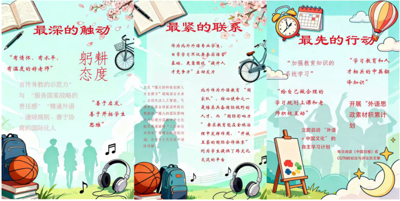 为深化培训成效,推动理论学习向实践转化,10月15日至20日,专用英语学院教师党支部与学生党支部联合发起“教育强国·师者心声”A4纸复盘行动。本次活动经过精心策划,设计了三个层层递进的核心问题,引导师生党员从认知深化到行动转化,构建了完整的学习闭环。