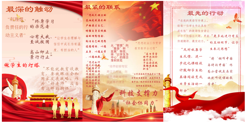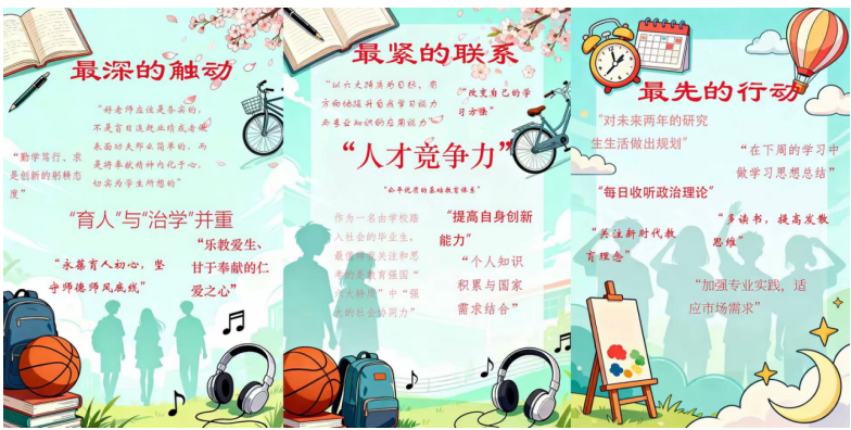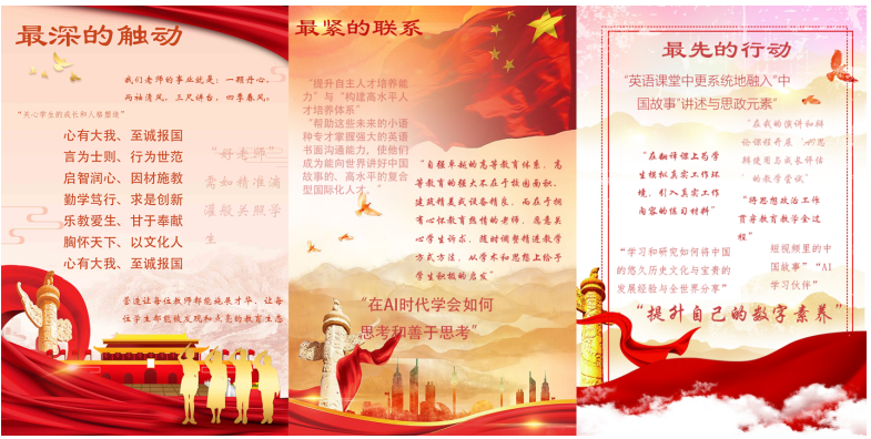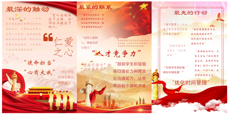 为持续扩大学习成效,专用英语学院教师党支部还将教师党员的精彩感悟与代表性观点摘编制作成系列主题海报,实现学习成果的可视化传播与长效激励。